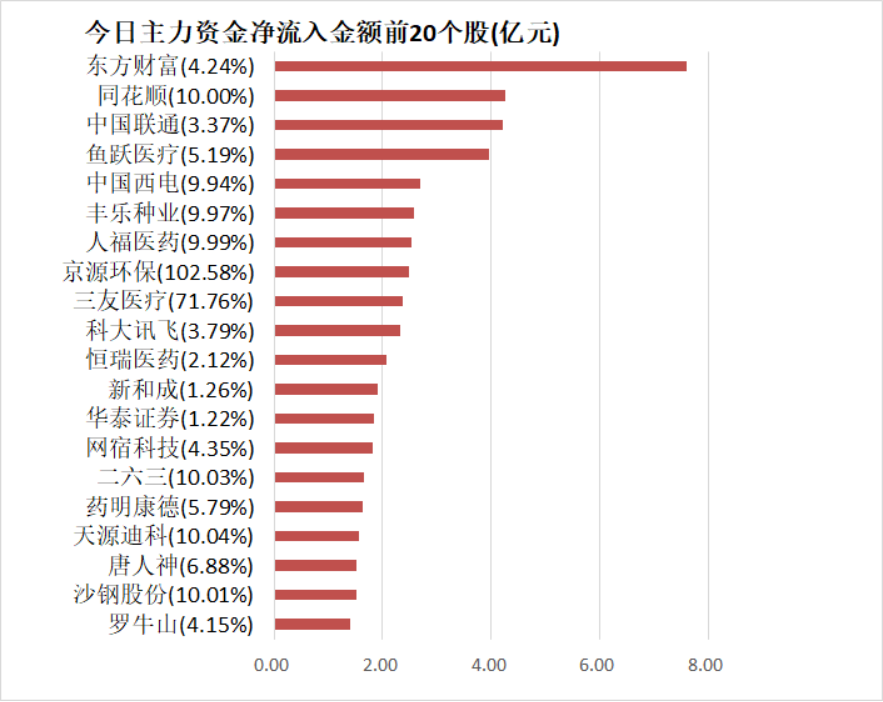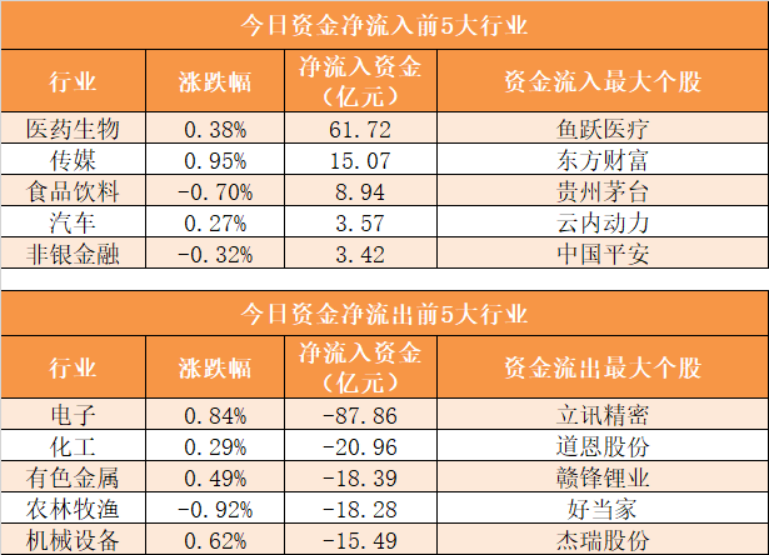 28个申万一级行业中,8个行业实现资金净流入,其中医药生物行业净流入61.72亿元居首。